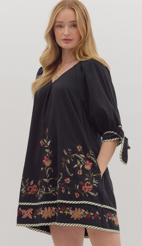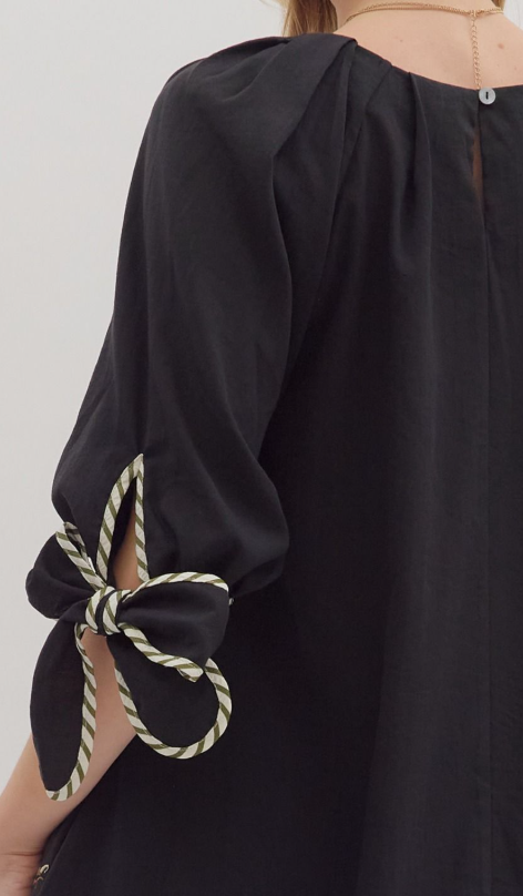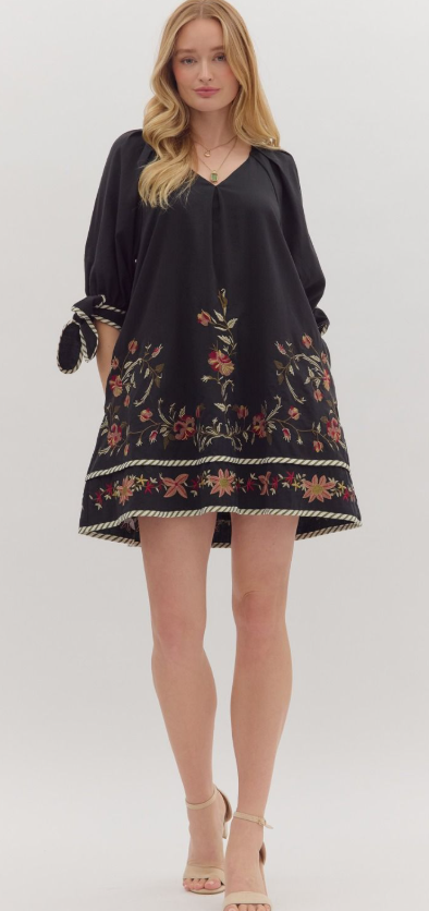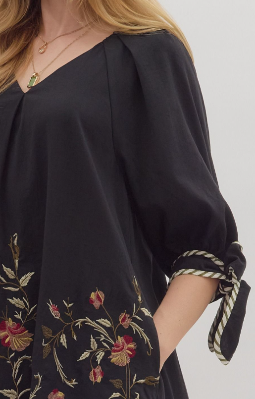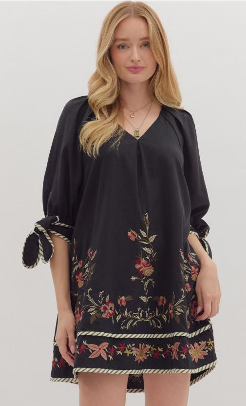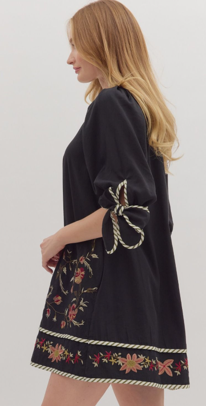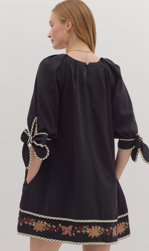 Floral embroidery raglan 3/4 sleeve mini dress featuring striped bow tie cuffs. Contrast embroidered hem. Button closure at back neck. Lined. Woven. Non-sheer. Lightweight