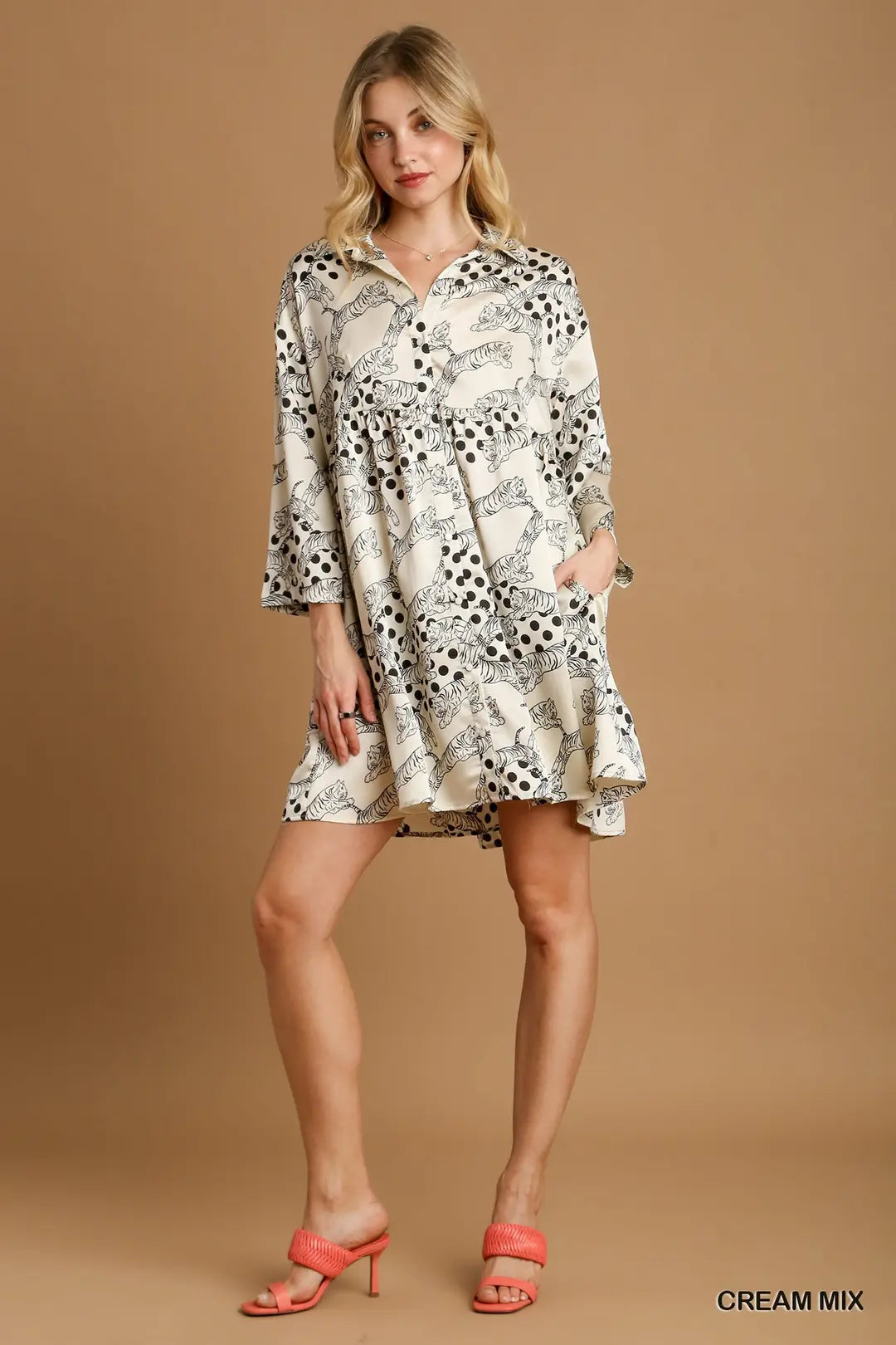 Satin Animal with Dotted Print A-Line Button Down Collared Dress & Hidden Side Pockets