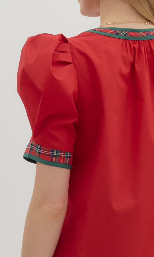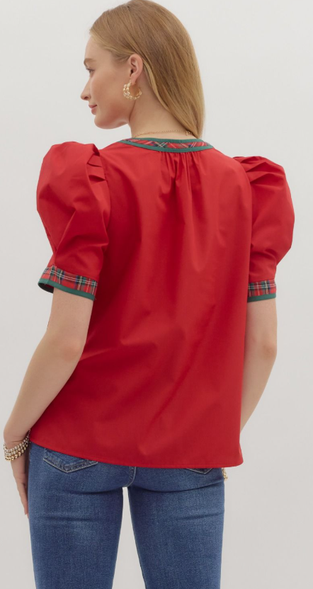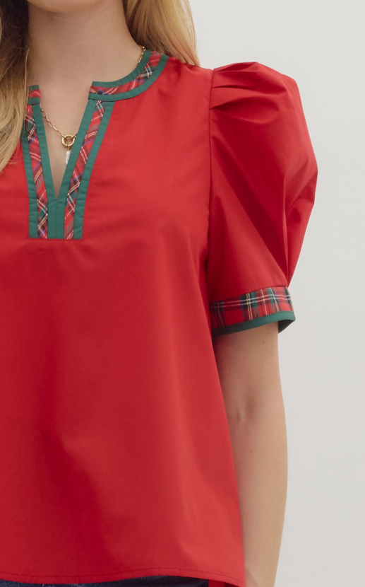 Solid short pleated puff sleeve top featuring contrast accent V-neck band. Unlined. Woven. Non-sheer. Lightweight.