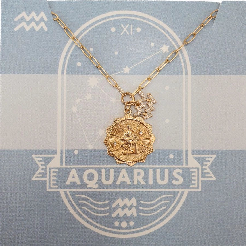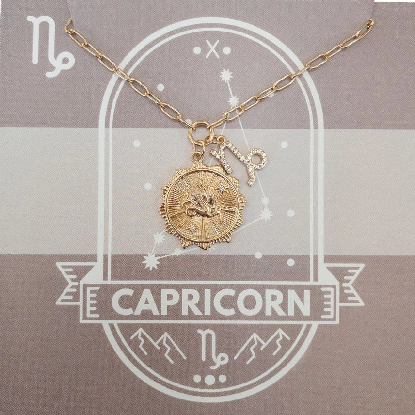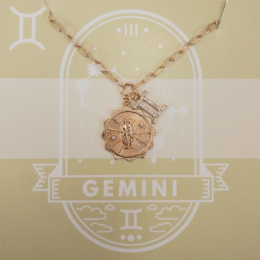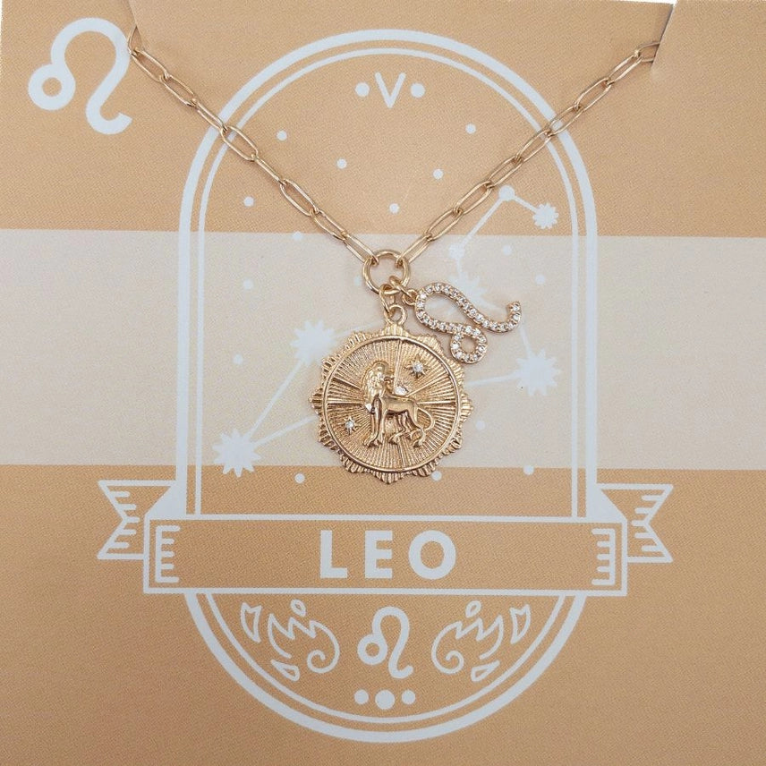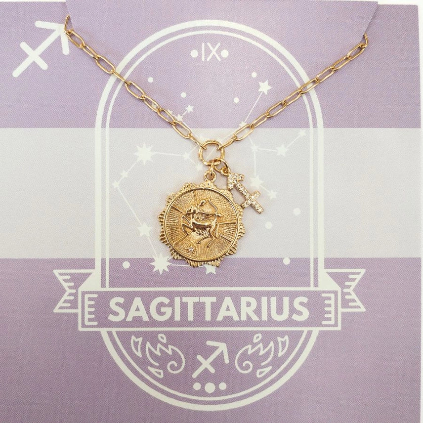 Our Zodiac Medallion Necklaces feature a 3/4" Pendants on a 18"-20" adjustable chain. The necklaces comes on a 4" x 4" custom card. Necklace is made in Gold Plated Brass material.
