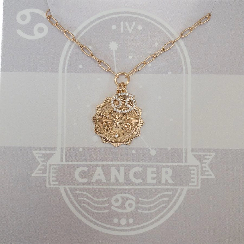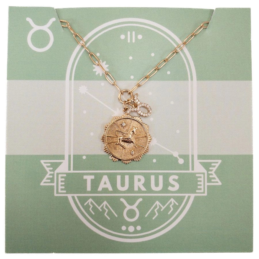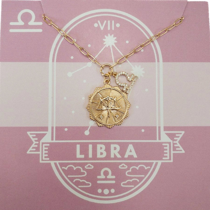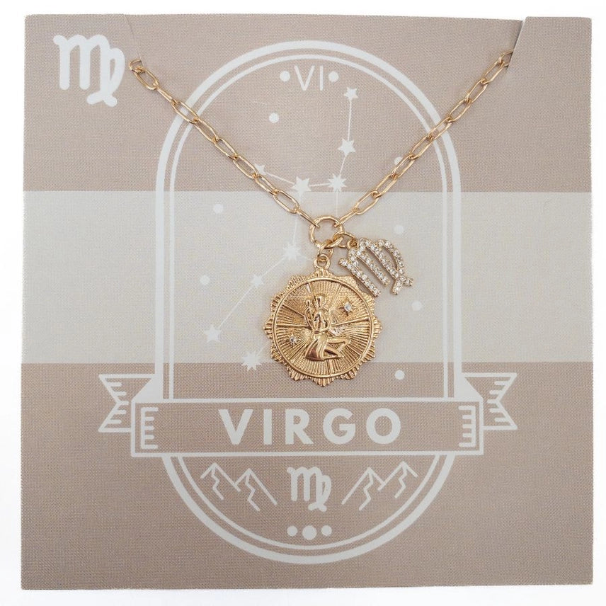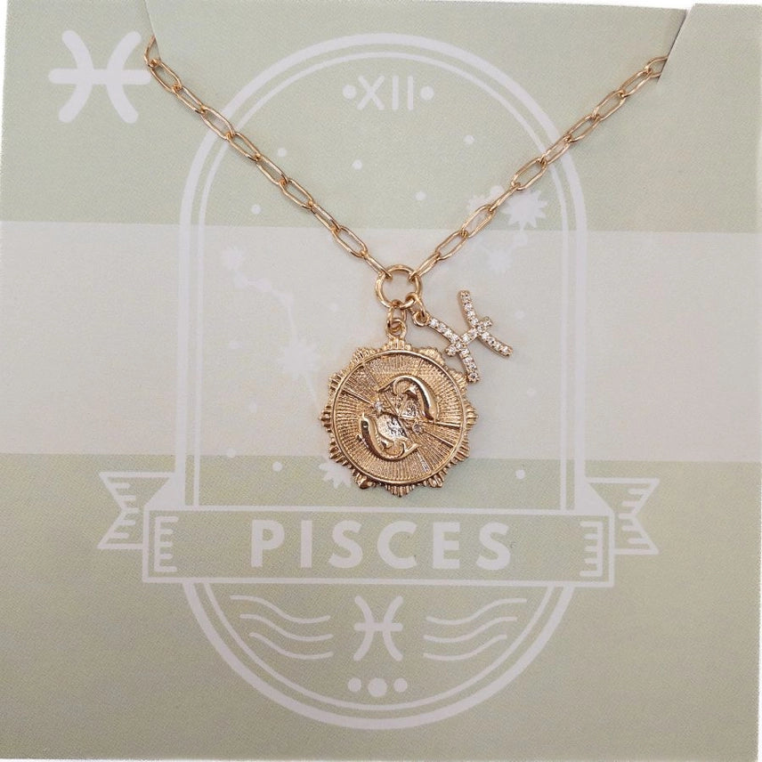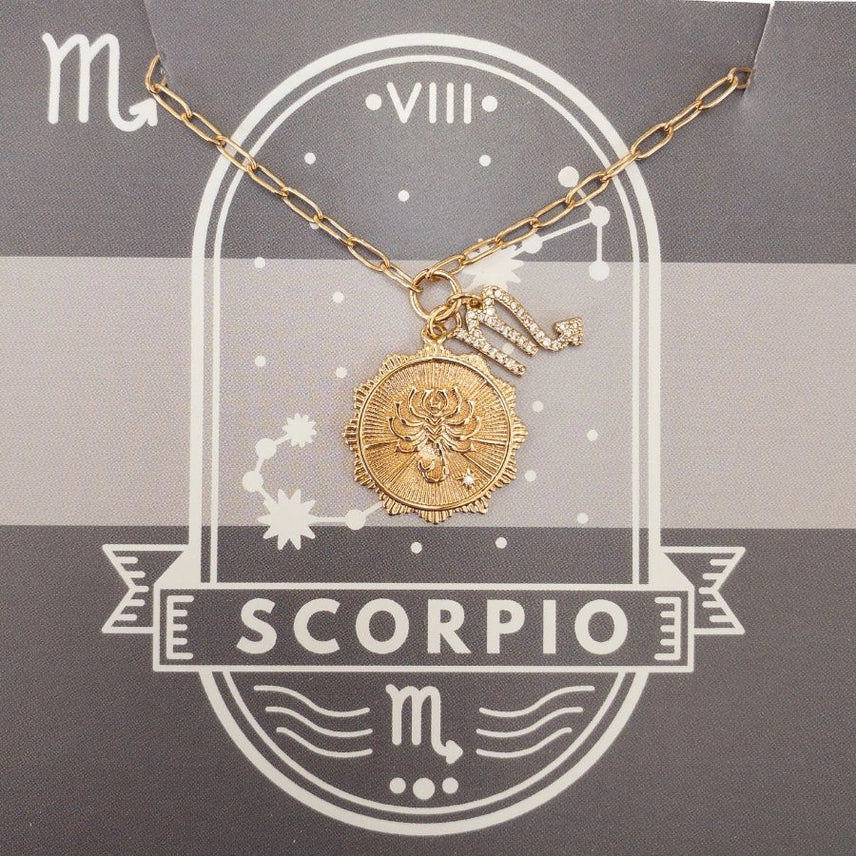 Our Zodiac Medallion Necklaces feature a 3/4" Pendants on a 18"-20" adjustable chain. The necklaces comes on a 4" x 4" custom card. Necklace is made in Gold Plated Brass material.