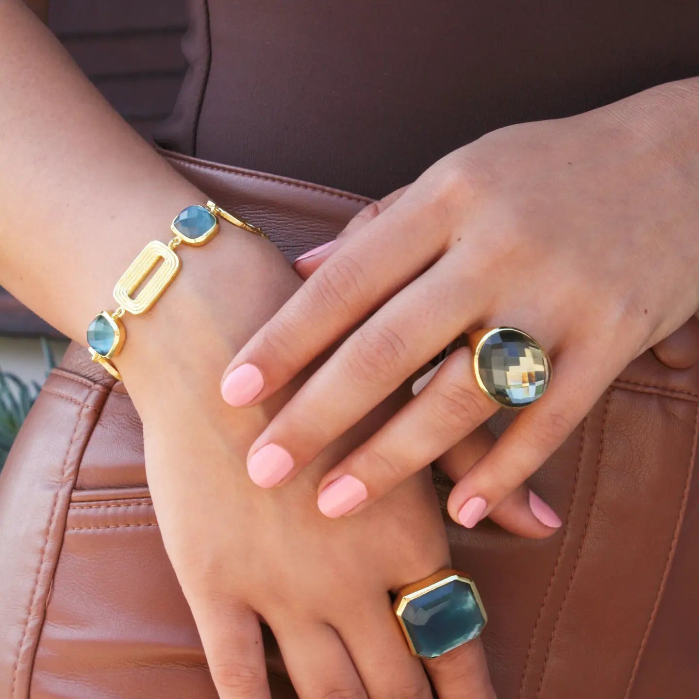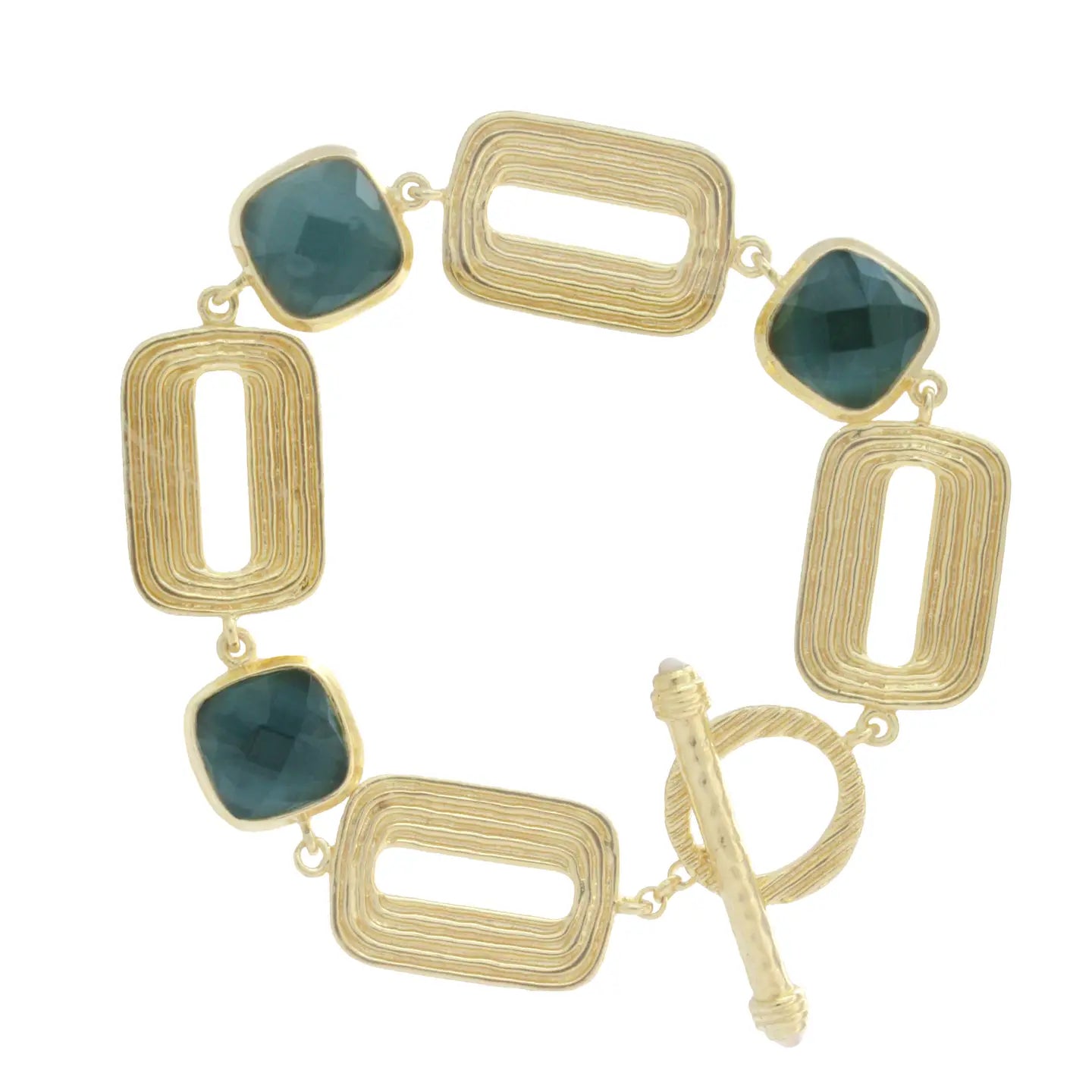 This bracelet features square stones set against a backdrop of textured, large rectangular links, combining elegance with a bold design. The square stones add a touch of sophistication and sparkle, while the textured rectangular links provide a striking visual contrast and a sense of modernity.
