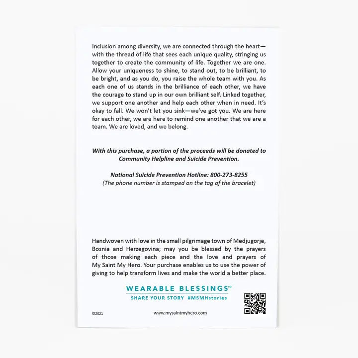 Handwoven in Medjugorje, Bosnia and Herzegovina Adjustable slipknot bracelet cording which opens to 9.5", closes to 6.25" Hematite or Mother of Pearl heart beads, silver-tone My Saint My Hero "blessed" Logo medal, "loved"/National Suicide Prevention Hotline Phone Number charm tag Medals hand-cast in a sacred site in Italy Belonging Heart Upon Heart Bracelet comes on an inspirational card.