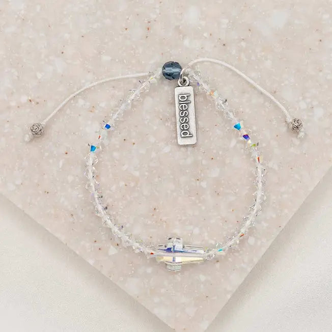 Radiant Bracelet - Aurora Borealis Adjustable bracelet cording which opens to 9" Aurora Borealis premium crystals, one blue crystal at closure, crystal cross, silver-tone "blessed" tag These premium heirloom-quality crystals are 2.5x more brilliant than other crystals, lead-free, sustainably manufactured and environmentally friendly Medals made in Italy Radiant Let There Be Light Bracelet - Aurora Borealis comes on an inspirational card.