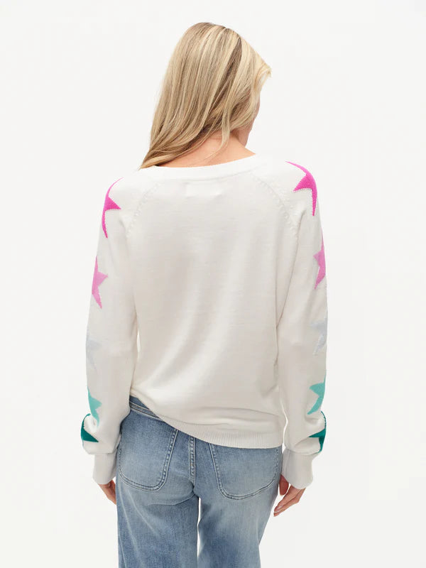 The Danielle Sweater features a striking colorful star graphic running down the sleeves, adding a playful touch to an everyday essential. Crafted from soft, lightweight fabric, it delivers all-day comfort. Perfect for layering or wearing solo, this piece combines eye-catching style with the ease you need for any occasion.