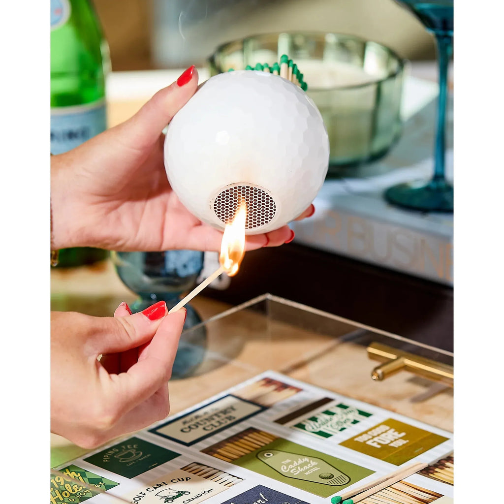 Get fired up with our Golf Ball Match Striker! This match strike is the perfect accessory for your coffee table, desk, or any space that could use a little flair. It features a strike pad on the bottom and comes with 140 matches. Keep this baby ready for any occasion, let's get lit!