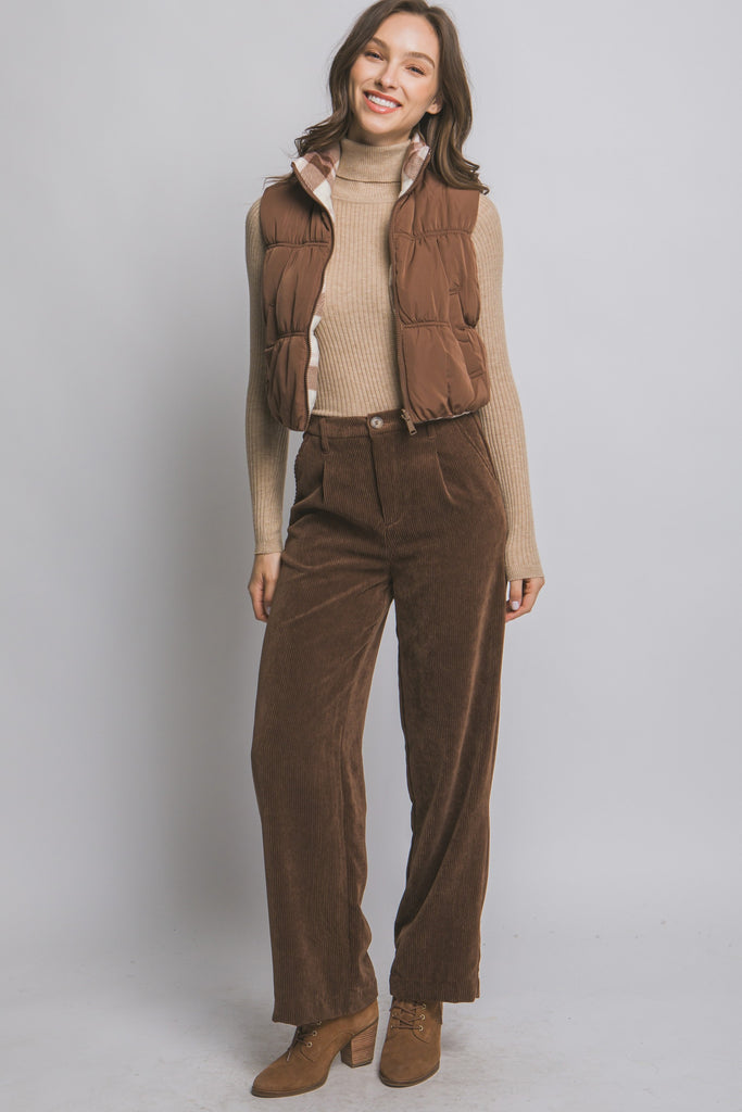FEATURES: - Reversible, Puffer Design & Pockets Both Sides SIZE + FIT - Model is 5'8" 33C bust, 26" waist, and 37" hips. - Model is Wearing Size Small