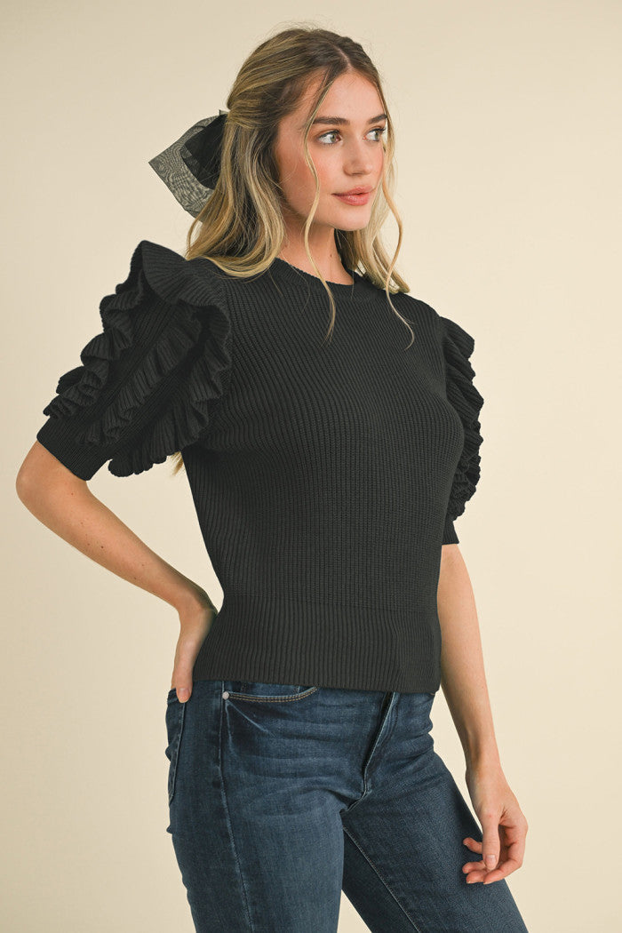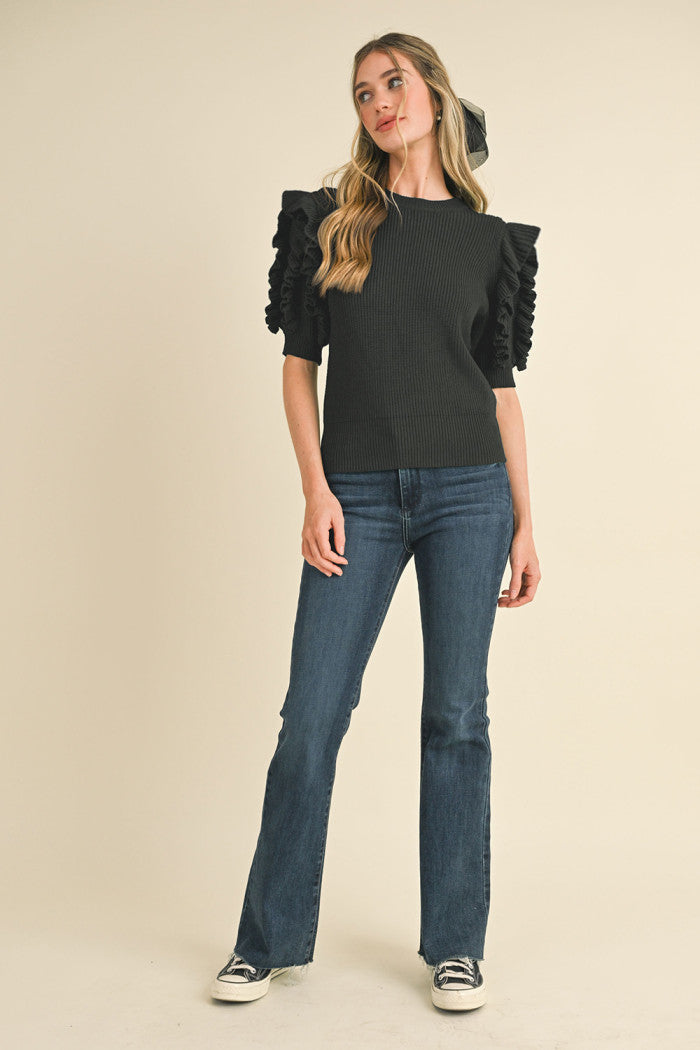 Serve effortless sophistication in this ruffled short sleeve sweater! This cozy sweater top features a classic round neckline and statement short sleeves with ruffle detail. Ribbed knit accents the neckline, cuffs, and hem. The semi-fitted bodice falls to the perfect tuckable length for all your high-waisted favorites!